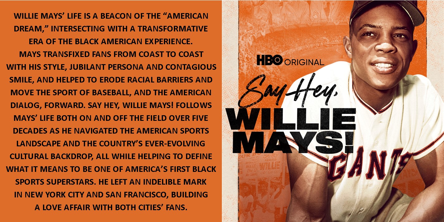 Willie Mays’ life is a beacon of the “American Dream,” intersecting with a transformative era of the Black American experience. Mays transfixed fans from coast to coast with his style, jubilant persona and contagious smile, and helped to erode racial barriers and move the sport of baseball, and the American dialog, forward. Say Hey, Willie Mays! follows Mays’ life both on and off the field over five decades as he navigated the American sports landscape and the country’s ever-evolving cultural backdrop, all while helping to define what it means to be one of America’s first Black sports superstars. He left an indelible mark in New York City and San Francisco, building a love affair with both cities’ fans.